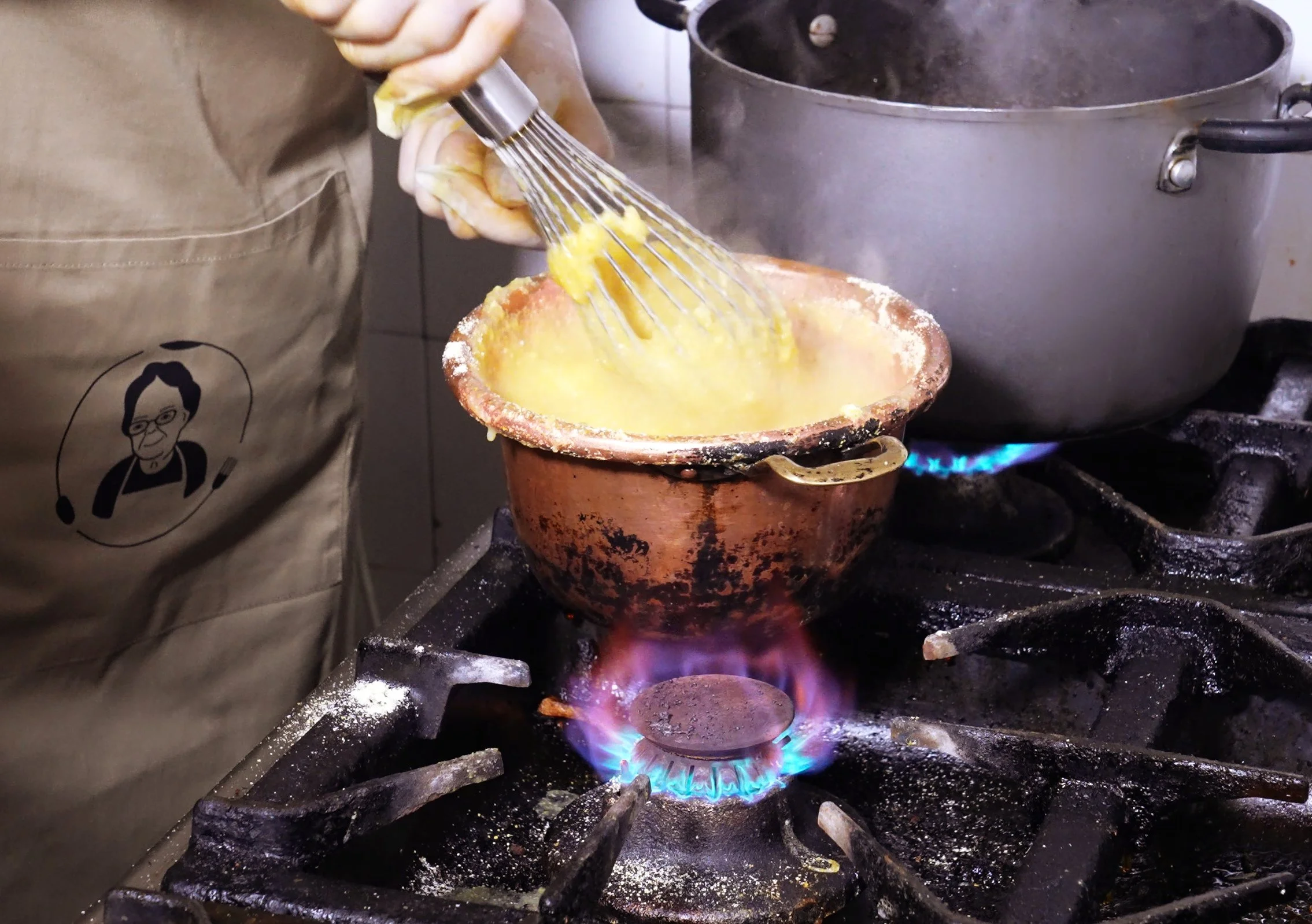 Gisella ha imparato questa ricetta dalla nonna che fin dai primi anni del ‘900 deliziava la sua famiglia durante il pranzo domenicale con questo sugo gustosissimo. Questo è un vero e proprio piatto della tradizione che piace così tanto da essere riproposto tutt’ora sia a casa che nei ristoranti. La stessa Gisella lo ha preparato centinaia di volte, sia a casa per i suoi nipotini che al ristorante che ha diretto per tanti anni a Smilovići, vicino a Momiano. Consiglia di accompagnare questo buon sugo con la polenta, ma non quella istantanea che usiamo oggi, bensì quella di una volta su un pentolino di rame. È vero, ci vuole tempo e olio di gomito per mescolarla ma quel sapore “bruciacchiato” e la consistenza perfetta si possono ottenere solo così.