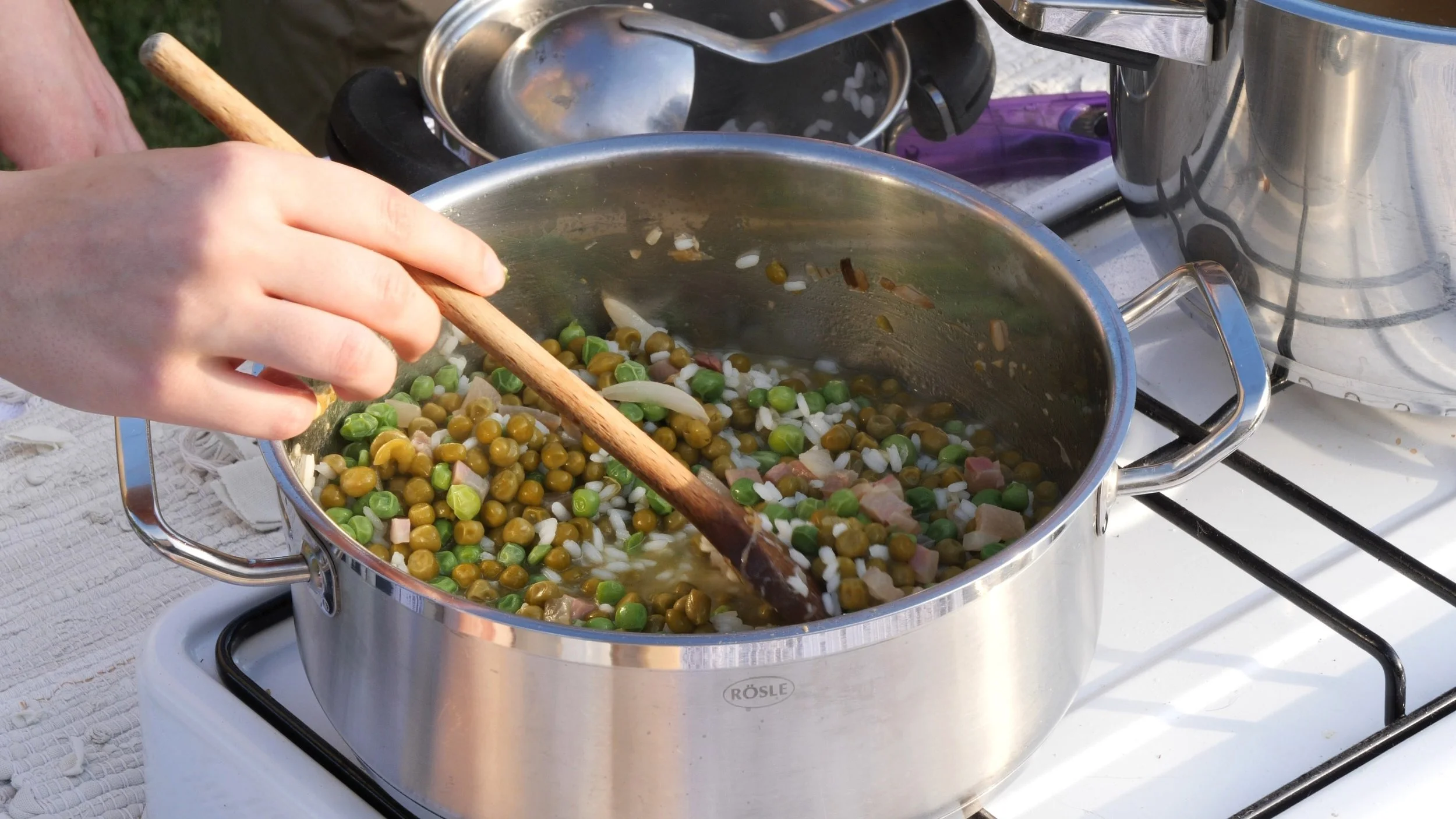 Per prima cosa mettete a cuocere i piselli nel brodo vegetale precedentemente preparato fino a renderli morbidi: ci vorranno circa 15 minuti. Nel caso in cui aveste utilizzato dei pisellini congelati il tempo di cottura sarà inferiore, attorno ai 5 minuti. Una volta pronti, scolateli e metteteli da parte. Procedete aggiungendo al brodo caldo il riso e fate cuocere per circa 10 minuti, fino a quando il riso sarà pronto.