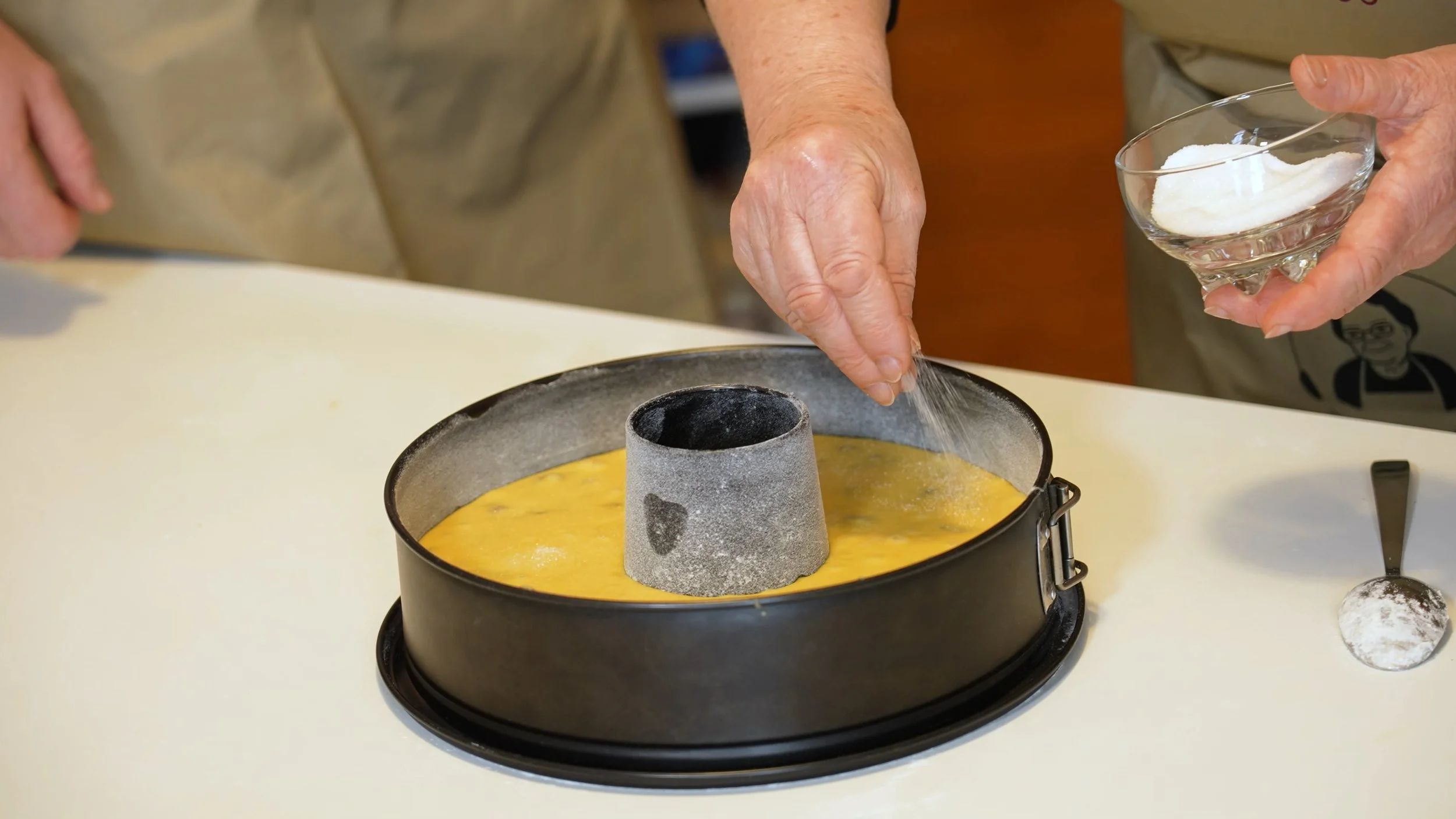 Versate il composto in una teglia da ciambella dal diametro di 28 cm imburrata e infarinata. Spolverate la superficie con un po’ di zucchero. Fate cuocere il composto in forno preriscaldato a 180°C per circa 45 minuti. Controllate la cottura con uno stecchino e, se necessario, prolungatela di altri 5 minuti.
