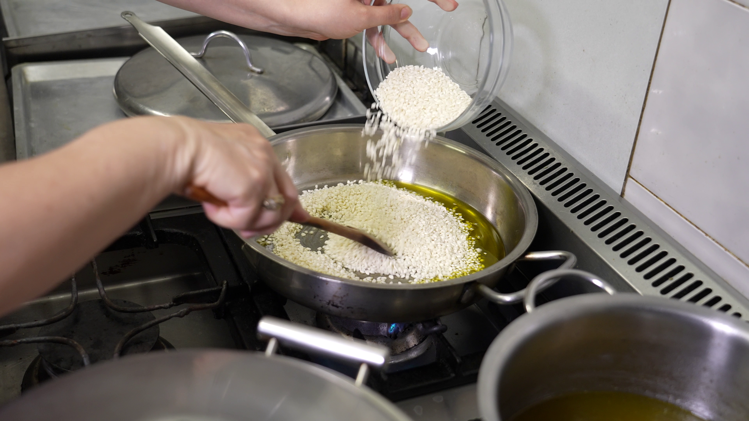 Quando il vino evapora potete aggiungere qualche mestolo di brodo di pesce caldo, fino quasi a coprire le seppie. Fate cuocere a fiamma media per altri 20 minuti, ricordandovi di girare spesso e aggiungere sempre un po’ di brodo quando ce n’è bisogno. A piacimento potete anche mettere un po’ di peperoncino. Nel frattempo tostate il riso in una padella capiente con dell’olio, mescolate bene e poi aggiungete il brodo di pesce, un mestolo alla volta fino a cottura.