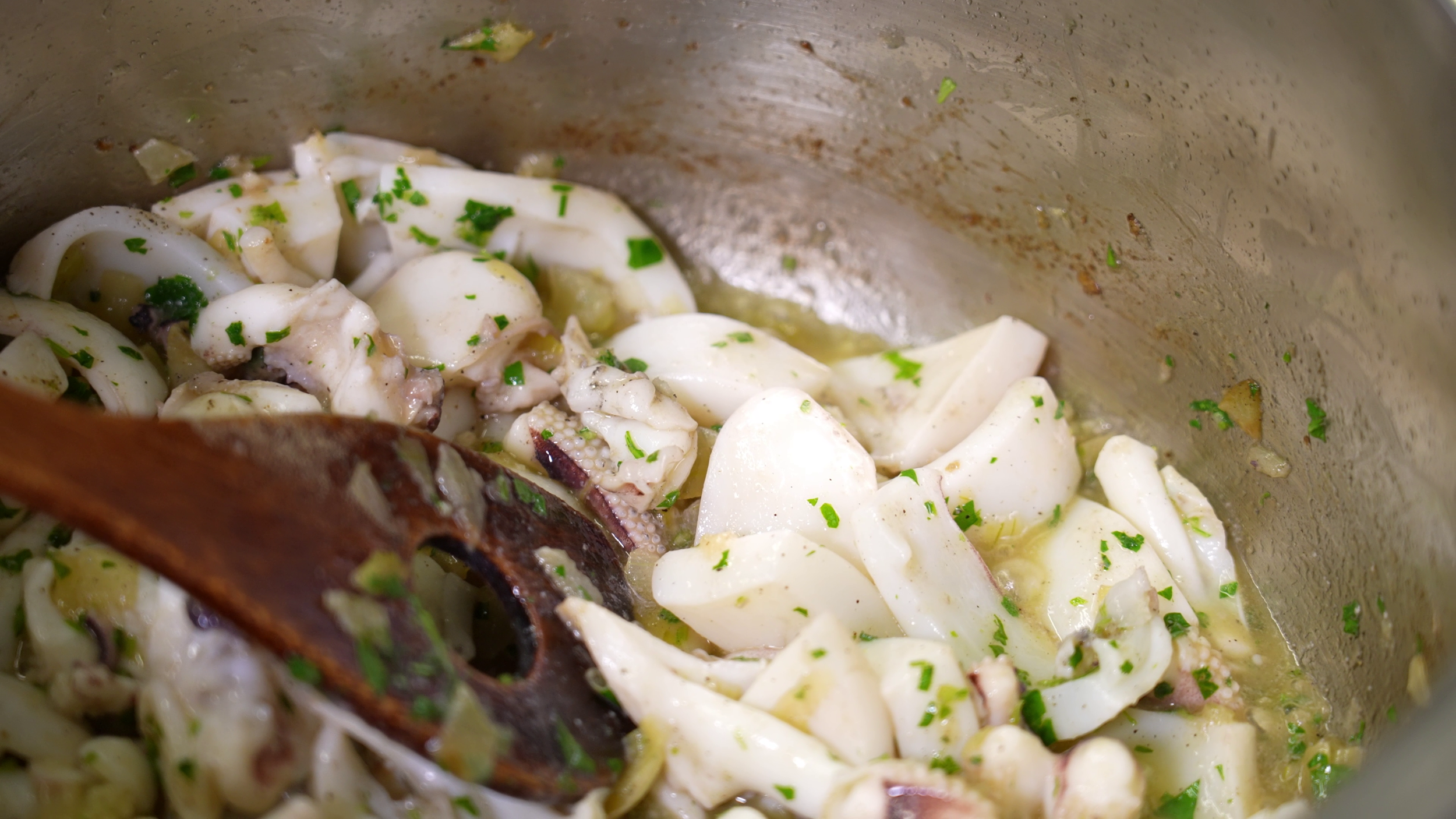 Lavate con cura le seppie e tagliatele a listarelle. Nel frattempo fate soffriggere per almeno 10 minuti la cipolla tritata con abbondante olio d’oliva. Aggiungeteci di tanto in tanto un po’ d’acqua per farle stufare e solo alla fine un pizzico di sale. Aggiungete poi le seppie e mescolate finché non prendono colore. A questo punto potete mettere il pepe, l’aglio, il prezzemolo, il vino e il succo di metà limone.