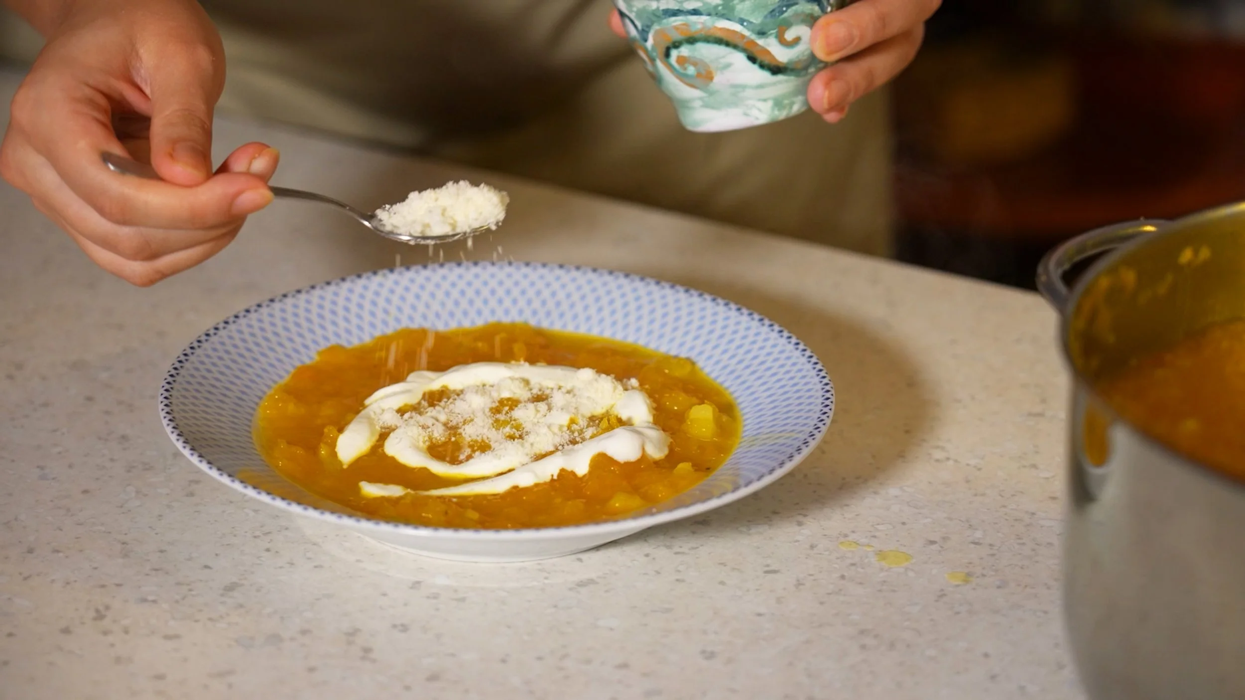 Una volta trascorso il tempo di cottura potete servire la minestra di zucca con della panna fresca da cucina e una spolverata di formaggio. Un filo di olio extravergine d’oliva a crudo e voilà, la cena è pronta!