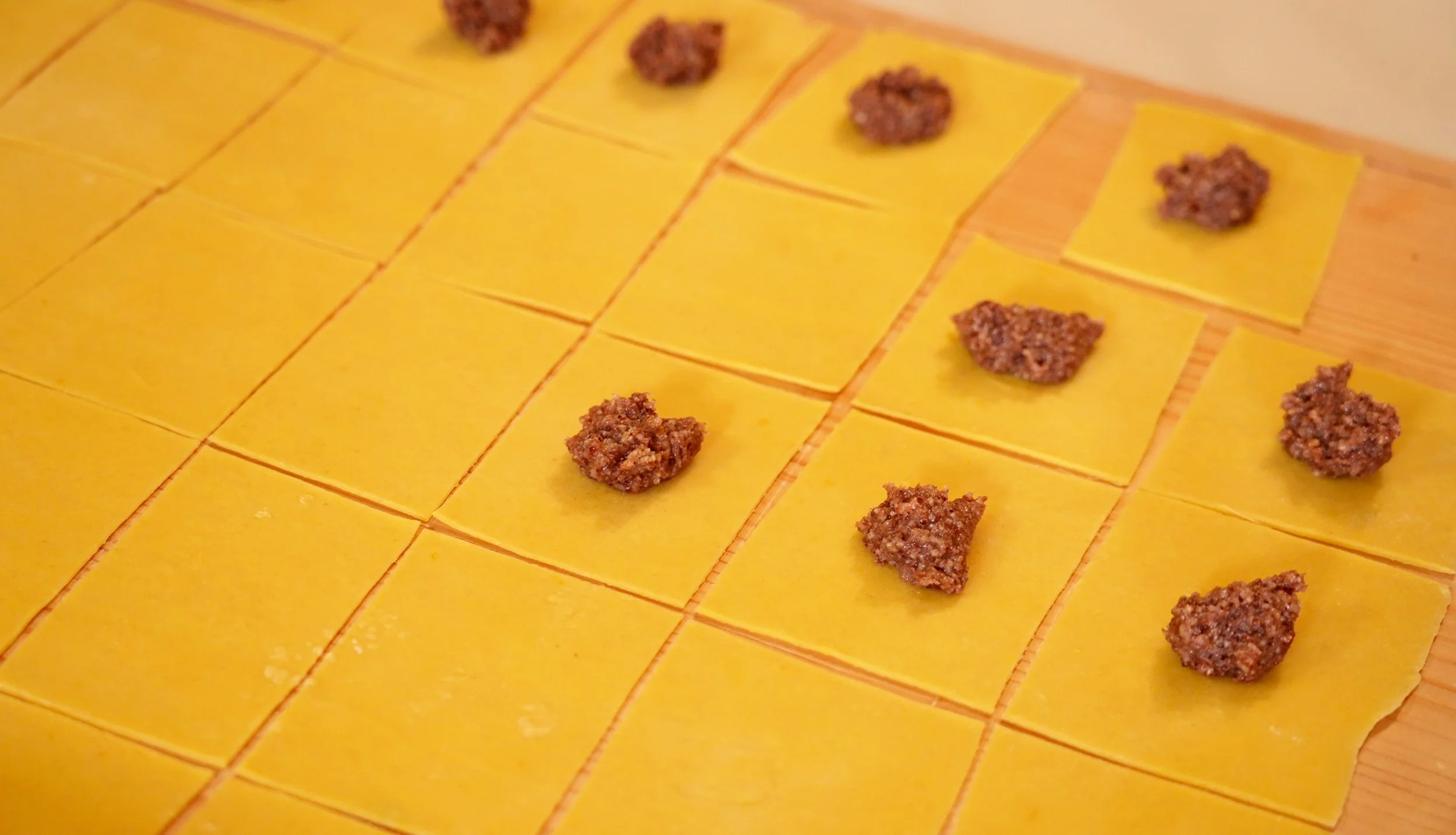 In una ciotola versate la cioccolata in polvere, la granella di noci e nocciole, la marmellata, il rum e il latte. Mescolate per amalgamare gli ingredienti. Se non vi piace qualche ingrediente o avete qualche allergia potete sostituirlo con quello che più vi piace! Anche della marmellata alle albicocche o qualche cucchiaio di Nutella vanno benissimo. Quando l’impasto ha riposato potete stenderlo con un mattarello, come si faceva una volta, o con la sfogliatrice. Dovete ottenere una pasta abbastanza sottile, così quando la friggerete è più croccante. Con il rullino zigrinato tagliate la pasta in quadrati da circa 8x8 cm.
