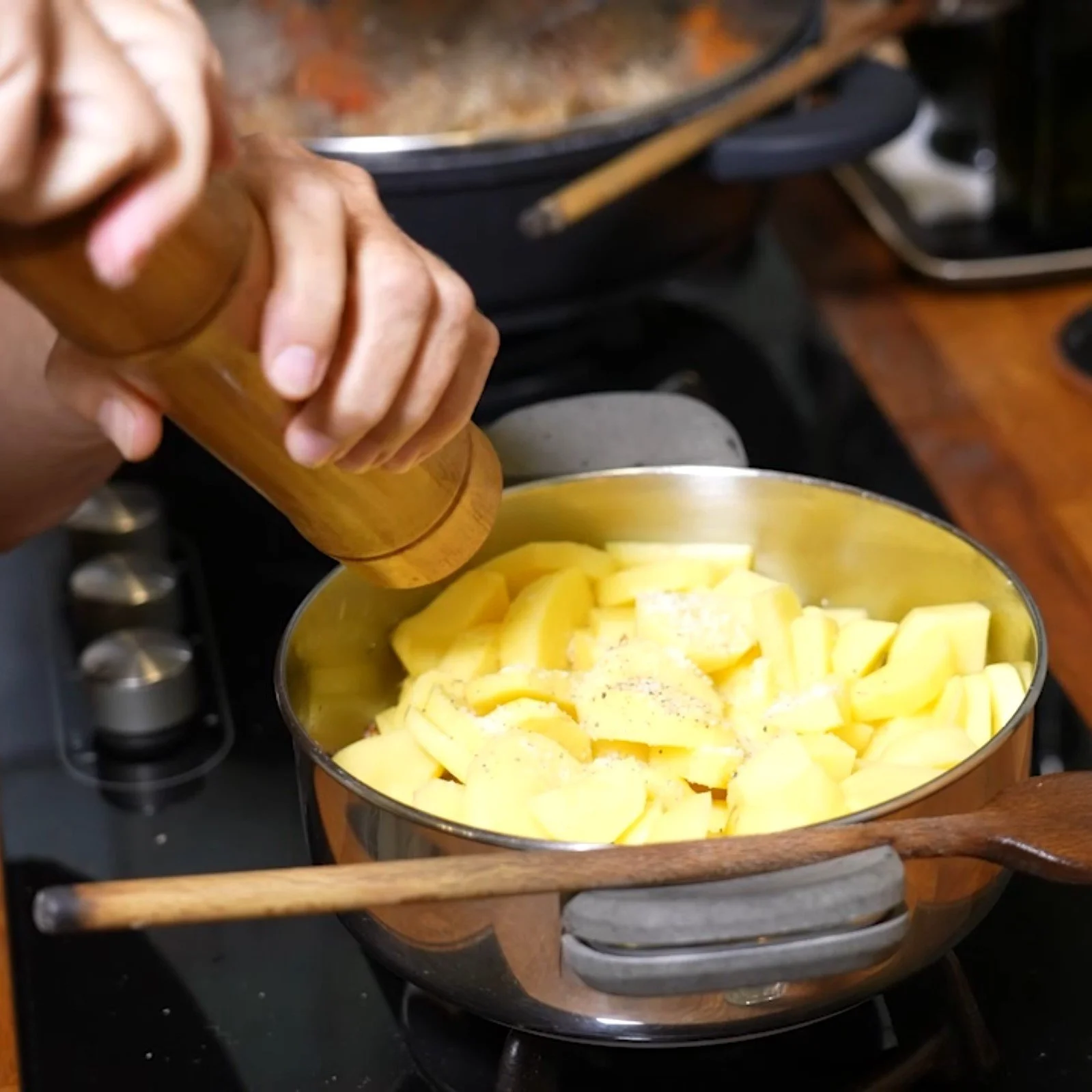 Aggiungete poi le carote tagliate a rondelle, i pomodorini e un po’ di sale e pepe. Coprite e lasciate cuocere il coniglio a fuoco lento per circa 30 minuti, fino a quando non diventa tenero e dorato. Nel frattempo sbucciate e tagliate le patate e cuocetele direttamente in pentola con un po’ di olio e cipolla per una ventina di minuti, mescolando di tanto in tanto.