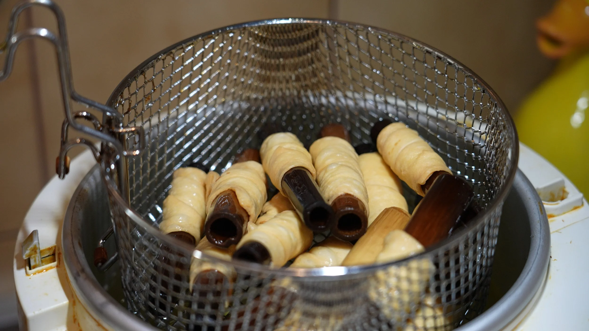 Ora stendete sottilmente il vostro impasto con il mattarello, ritagliate delle forme rettangolari o ovali e avvolgetele attorno agli appositi cilindri metallici. Friggete i cannoni in abbondante olio caldo fino a che diventano dorati e marroncini. Una volta pronti scolateli su carta assorbente e lasciateli raffreddare prima di rimuovere i cilindri. Infine farcite i cannoni con una sac à poche. Croccanti fuori e cremosi dentro: sono una gioia per gli occhi e per il palato.