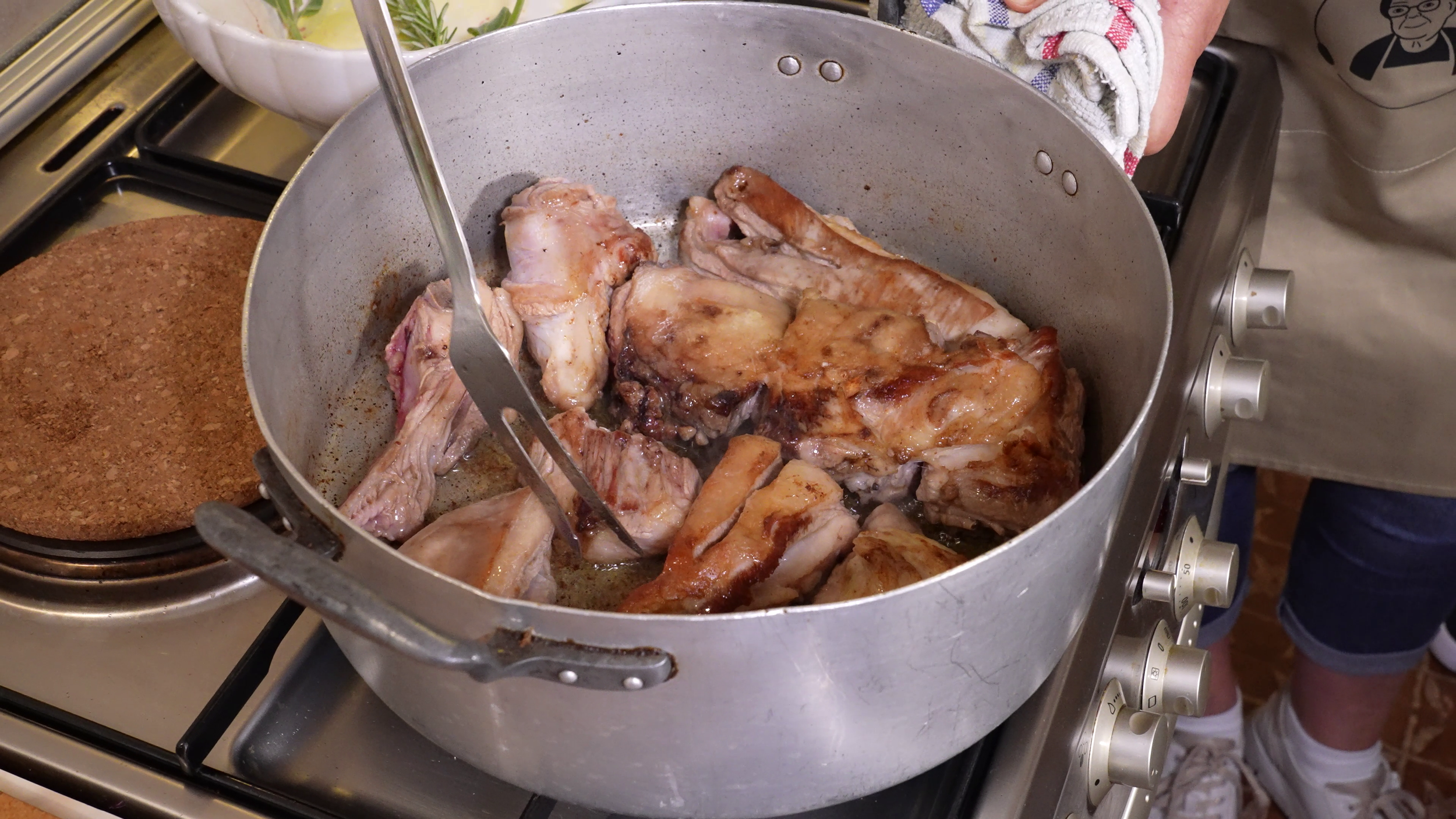 Aggiungete il rosmarino e la salvia assieme al vino e lasciatelo sfumare finché l’alcol non evapora e aggiungete un po’ d’acqua per coprire leggermente la carne. Copriamo la padella con un coperchio, abbassiamo la fiamma e cuocete per circa 1 ora e mezza, assicurandovi di mescolare di tanto in tanto e aggiungendo acqua se necessario.
