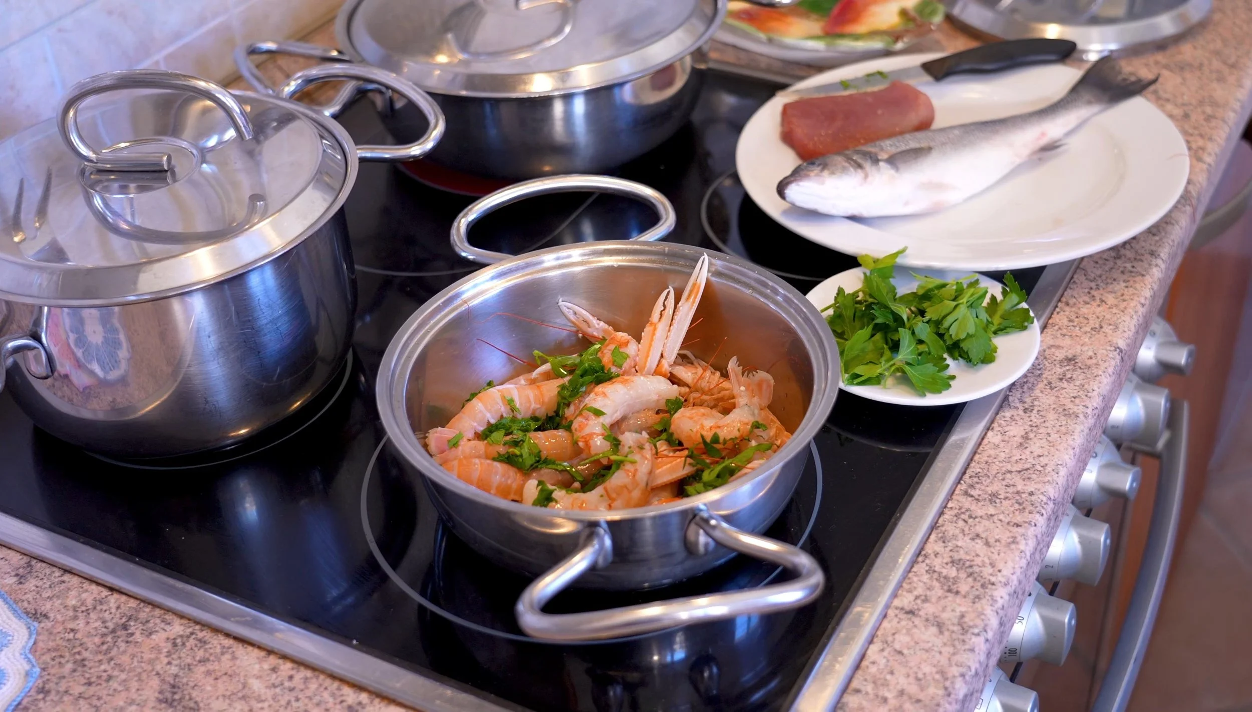In una padella oleata aggiungete dell’aglio, se gradito, e mettete il fuoco a fiamma viva. Aggiungete gli scampi o i gamberetti con del prezzemolo e del peperoncino. Sfumate con un po’ di vino bianco e cuocete per 3-5 minuti. Nel frattempo lessate le patate in acqua leggermente salata.