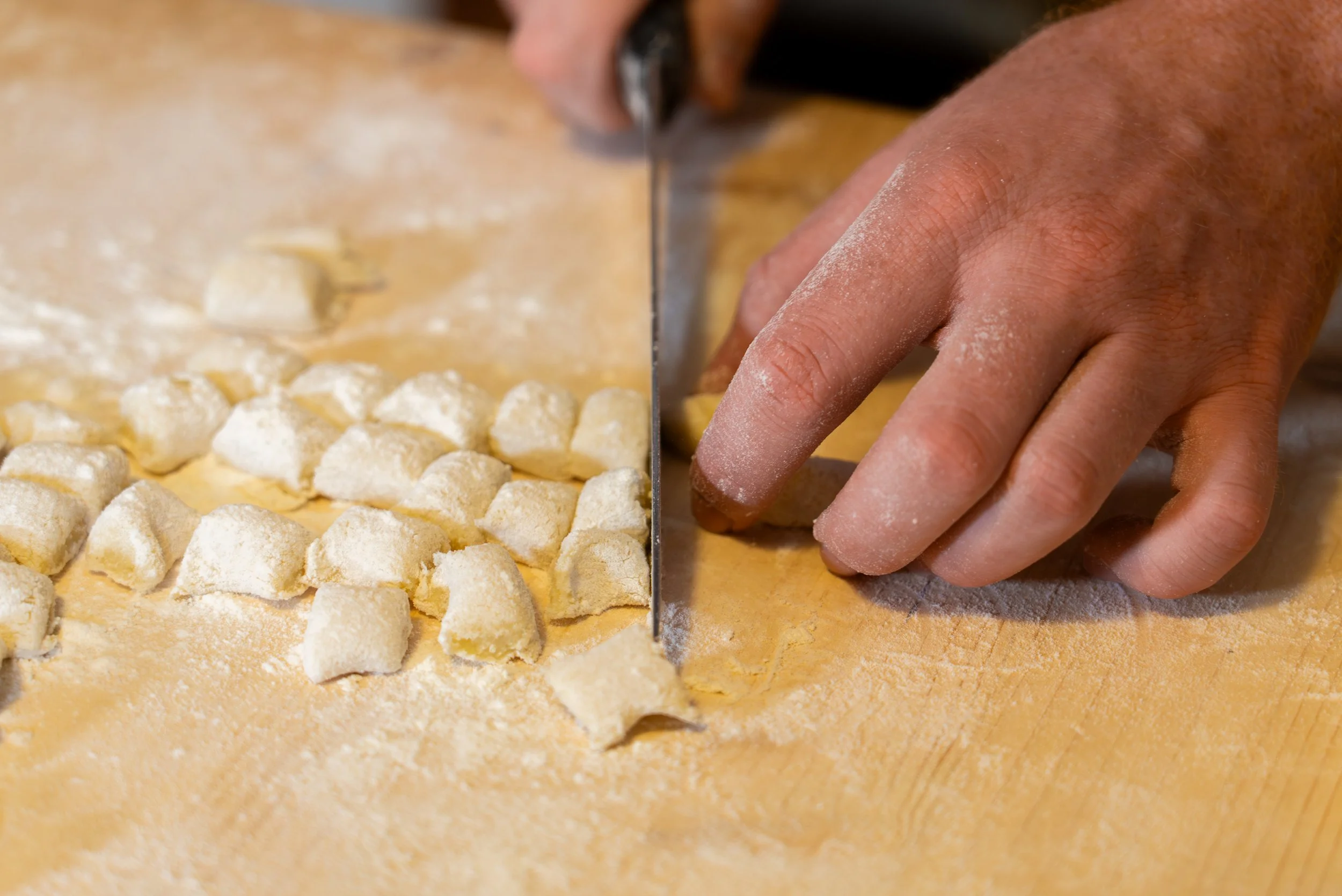 Infarinate leggermente il piano di lavoro, formate delle palline di impasto e arrotolatele fino a creare lunghi rotoli. Allineate i rotoli e tagliateli a tocchetti di circa 2 cm, poi passate ogni gnocco sul retro di una grattugia per creare le classiche rigature. Dopo che avete preparato gli gnocchi cuoceteli in acqua bollente salata e scolateli non appena salgono a galla.