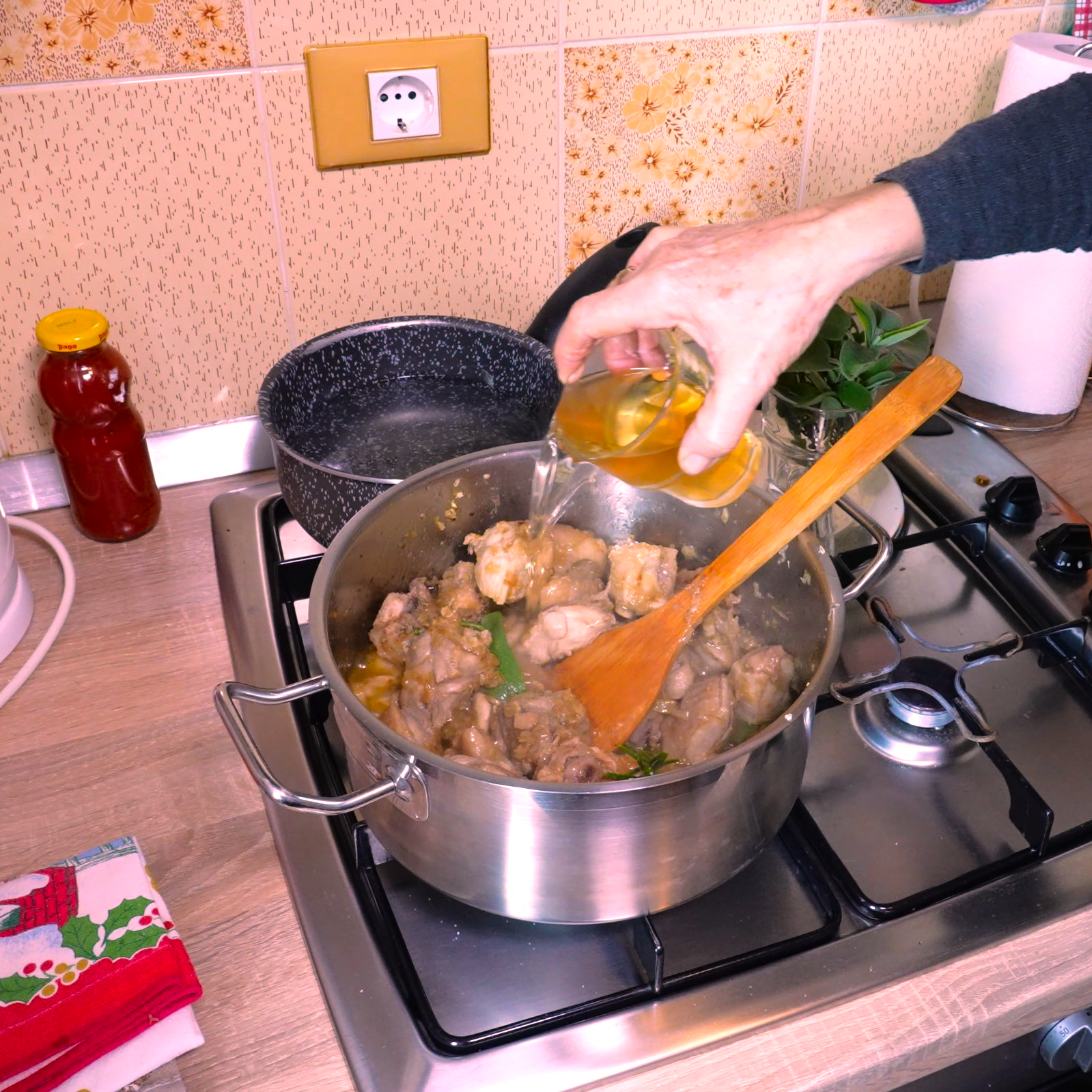 Trascorso questo tempo aggiungete il sugo di pomodoro, sale, pepe, le spezie e mezzo bicchiere di vino e lasciate cuocere per 30 minuti. Dopo aver aspettato questo tempo aggiungete l’altra metà di vino e lasciate cuocere finché la carne non è morbida. Ricordatevi di girare di tanto in tanto e aggiungete dell’acqua se necessario.